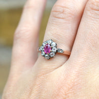 A really wonderful ruby and diamond cluster ring that was made circa 1890s. It sits low on the finger and is comfortable to wear. The ruby is likely of Burma origin with a blue hue. It is more translucent than transparent, however, it wins on colour with its deep reddish-pink colour. Surrounding the ruby are eight bright white and well-matched old mine cut diamonds, which have their own unique sparkle. There are a further two diamonds on the shoulders. Overall it is a lovely engagement ring, and perfect for someone who loves rose gold and rubies!