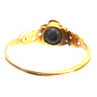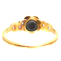 The ring features elegant scrollwork shoulders, beautifully rendered in gold, reflecting the refined artistry of the era. These sculpted details lead to a smooth shank, showcasing the craftsmanship so admired in Georgian jewellery.