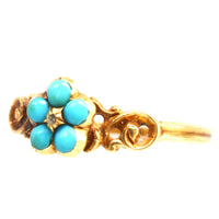 A sentimental and beautifully made piece, this Georgian ring dates to the William IV period of the 1830s and is made in rich 18ct gold. At its centre blooms a delicate five-petal turquoise flower, reminiscent of a Forget-Me-Not — a motif traditionally symbolising remembrance, fidelity, and enduring affection.