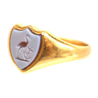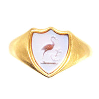 This fine Victorian 18ct gold signet ring made by Deakin & Francis Ltd, features a shield-shaped carnelian intaglio engraving of a stork standing with its foot on an anchor. A beautifully crafted piece, this ring embodies the elegance and symbolism of the Victorian era, while also carrying a fascinating historical connection.