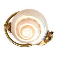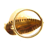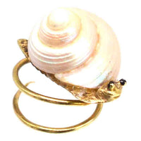 This delightful small snail pin is a whimsical and beautifully crafted piece, featuring a real sea shell as its natural spiral shell. Made from 18ct gold, the snail's body is intricately formed, complete with two black enamel eyes that bring it to life.